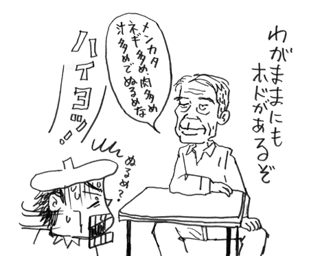 わはははは!なるなる!今思ったんだけど、正しい店の条件のヒトツとして・・・・例えば「良いラーメン屋の見つけ方」なんてのを漫画で描くとするじゃん。そしたら・・・・・(その1)まず店内を見回してみましょう。客にジジイがいる店は、よい店です。 |
